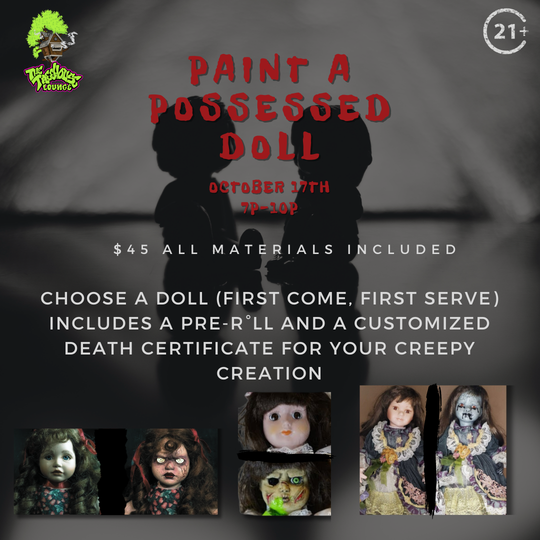 Arrive early! You’ll get to pick your own doll (first come, first serve)Then settle in with your included pre r°ll and get working on your creepy creation!All materials included.Each doll will come with a customizable Death Certificate. Give it a name, age, and its peculiar cause to its demise!D@b Bar included$4521+