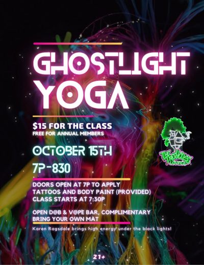 Doors open at 7p to get settled in, apply the glow tattoos and body paint, sesh, and get ready to move, and have fun. Class starts at 7:30p.Every month we’ll have a DIFFERENT playlist ~ this month is spooky themed!Karen Ragsdale of Soulworks Yoga & Wellness teaches a HIGH energy, but NOT intense class. We’ll […]